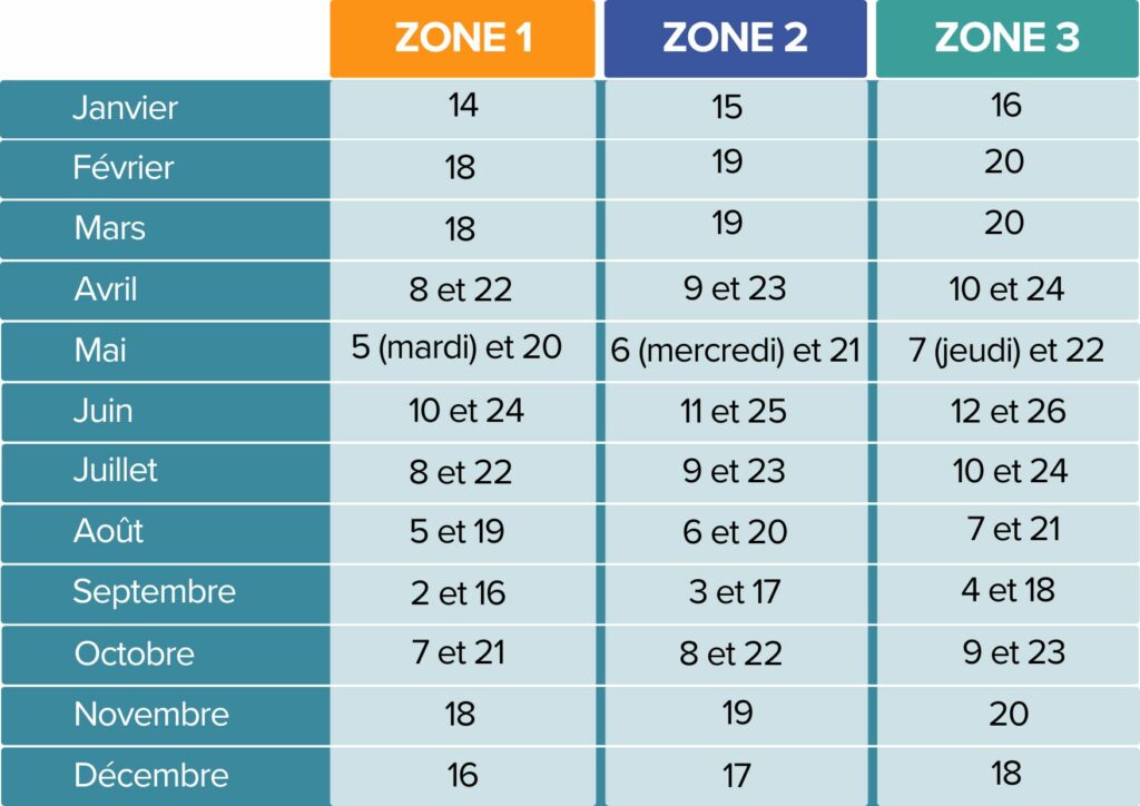 La collecte s’effectue par zone, en fonction des quartiers et démarre à 7h00 (6h00 en été).